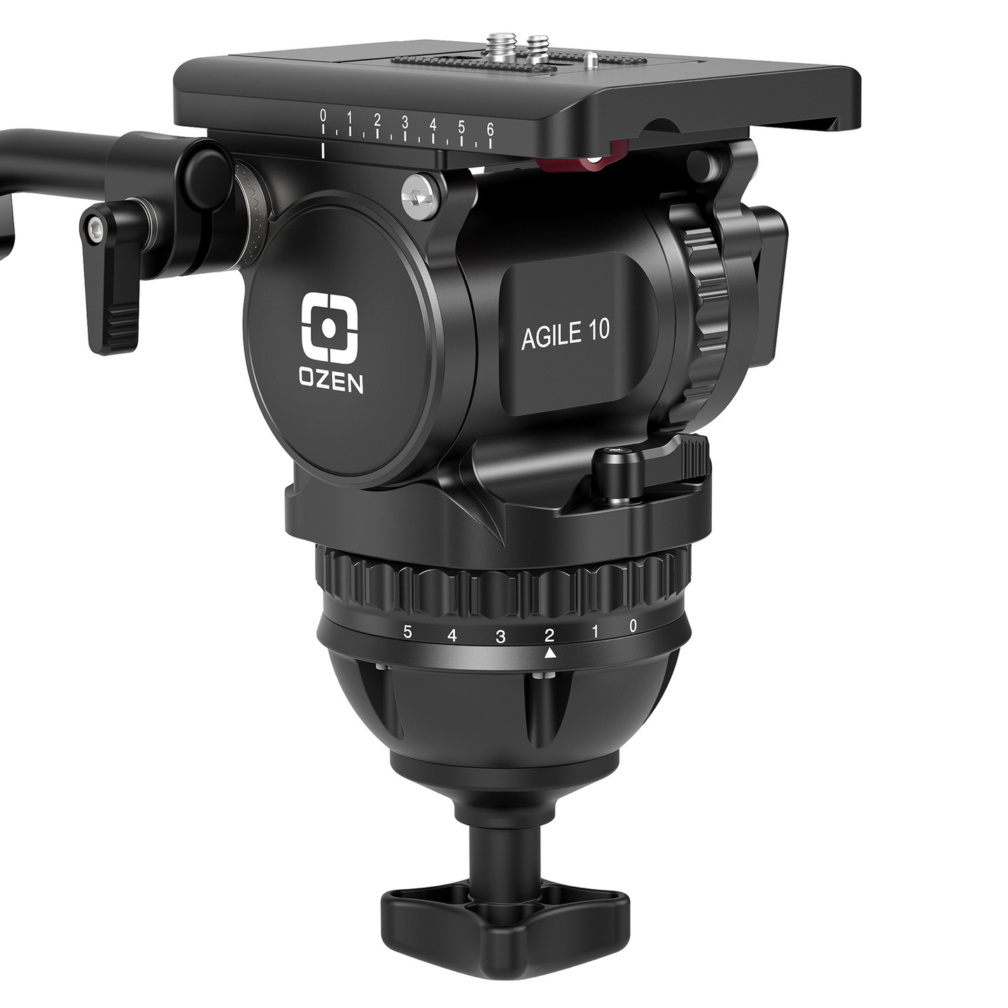 100mm fluid head, FULL-SIZED E-Z LOAD, 5/5+0 increments fluid resistance, (10) increments counterbalance, extending pan bar, illuminated bubble balance