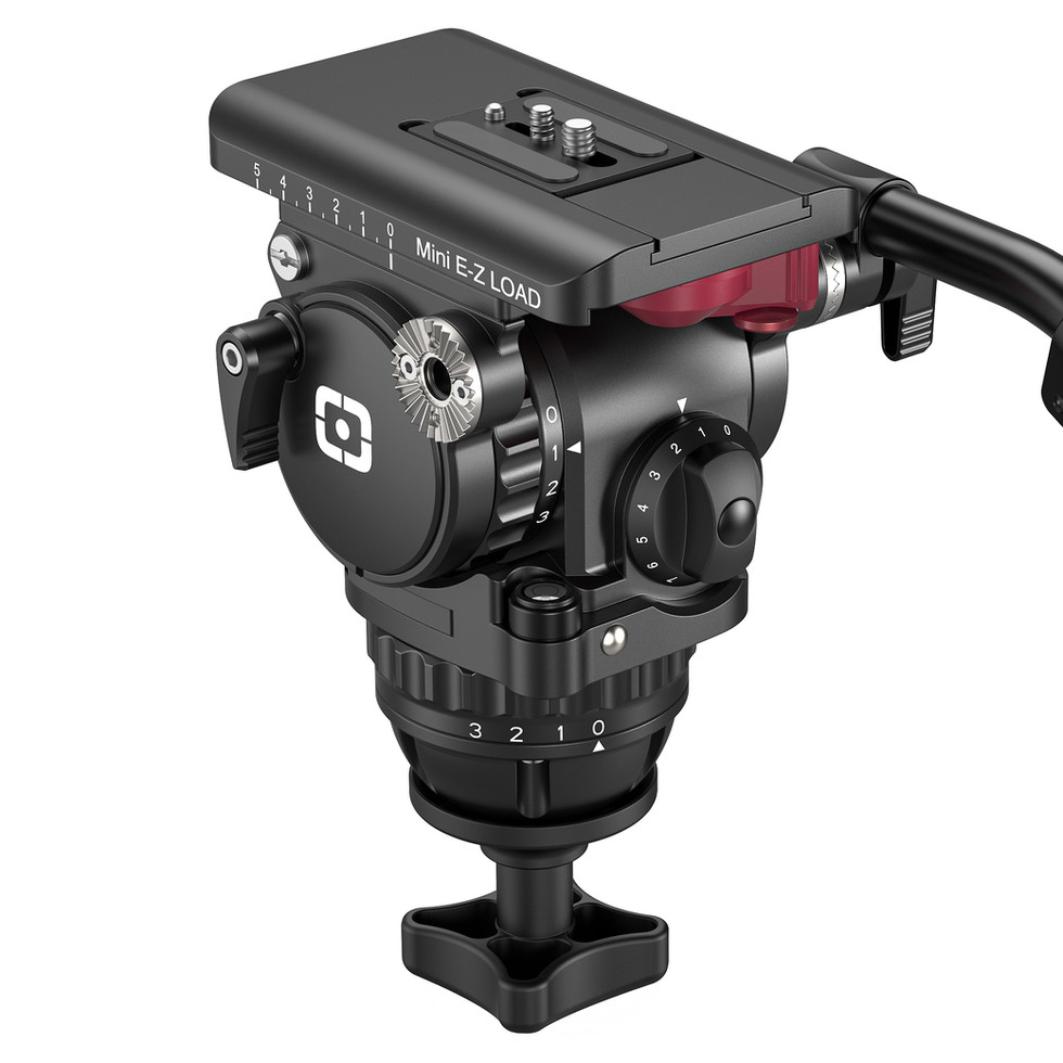 75mm fluid head, Mini E-Z LOAD, 3/3+0 increments pan/tilt fluid drag, (7) increments counterbalance, extending pan bar, illuminated bubble balance